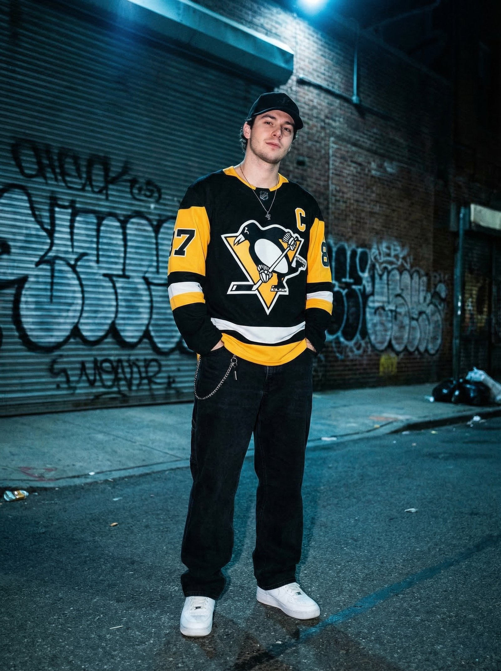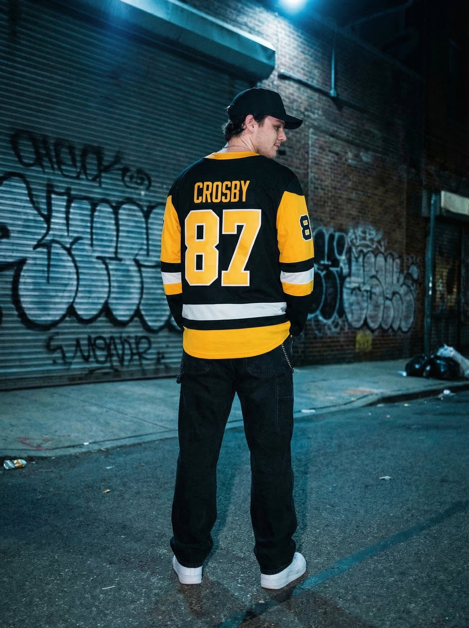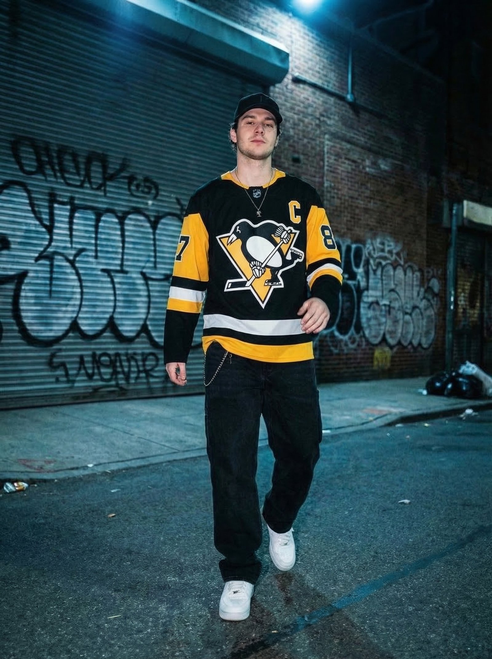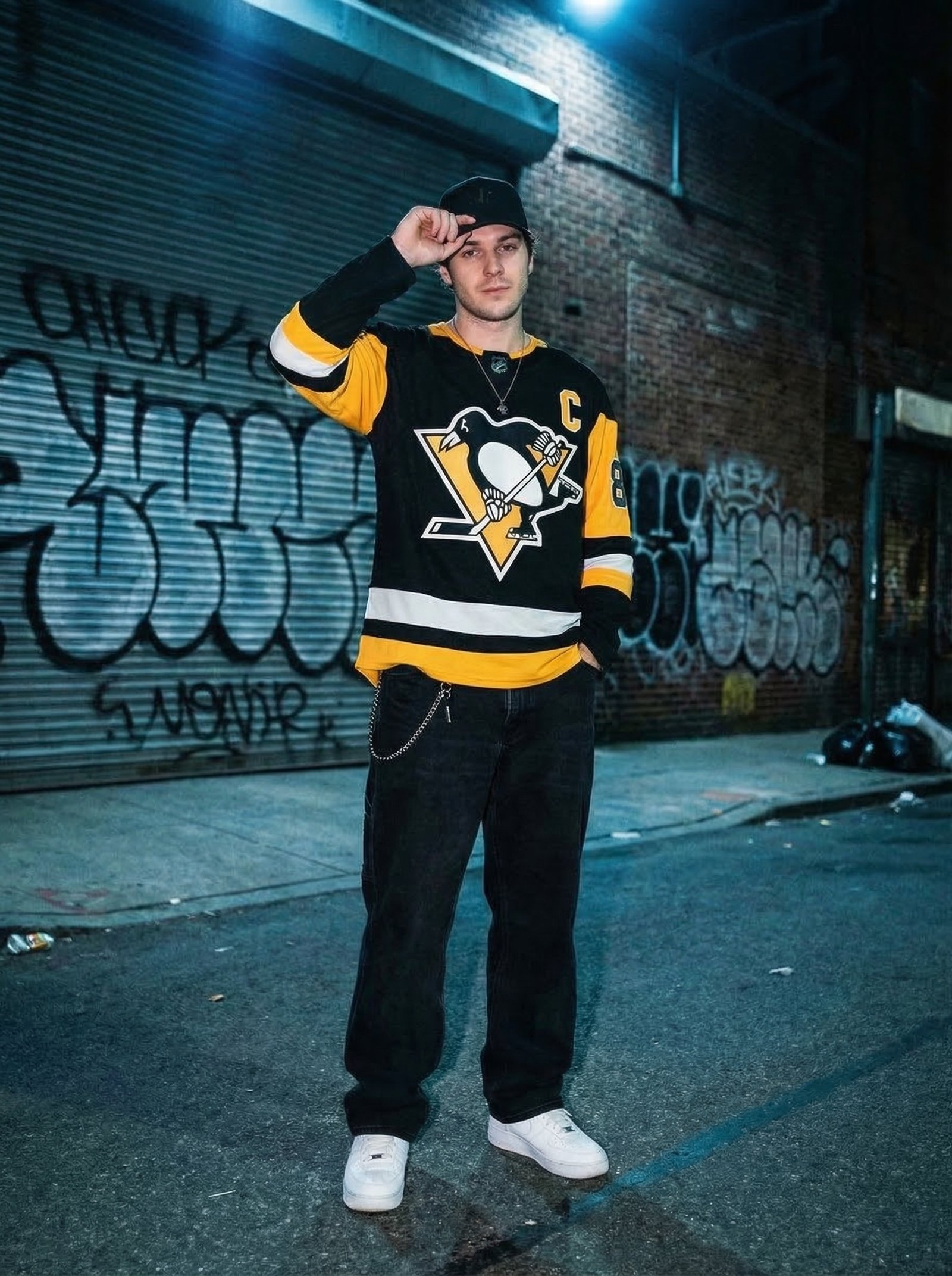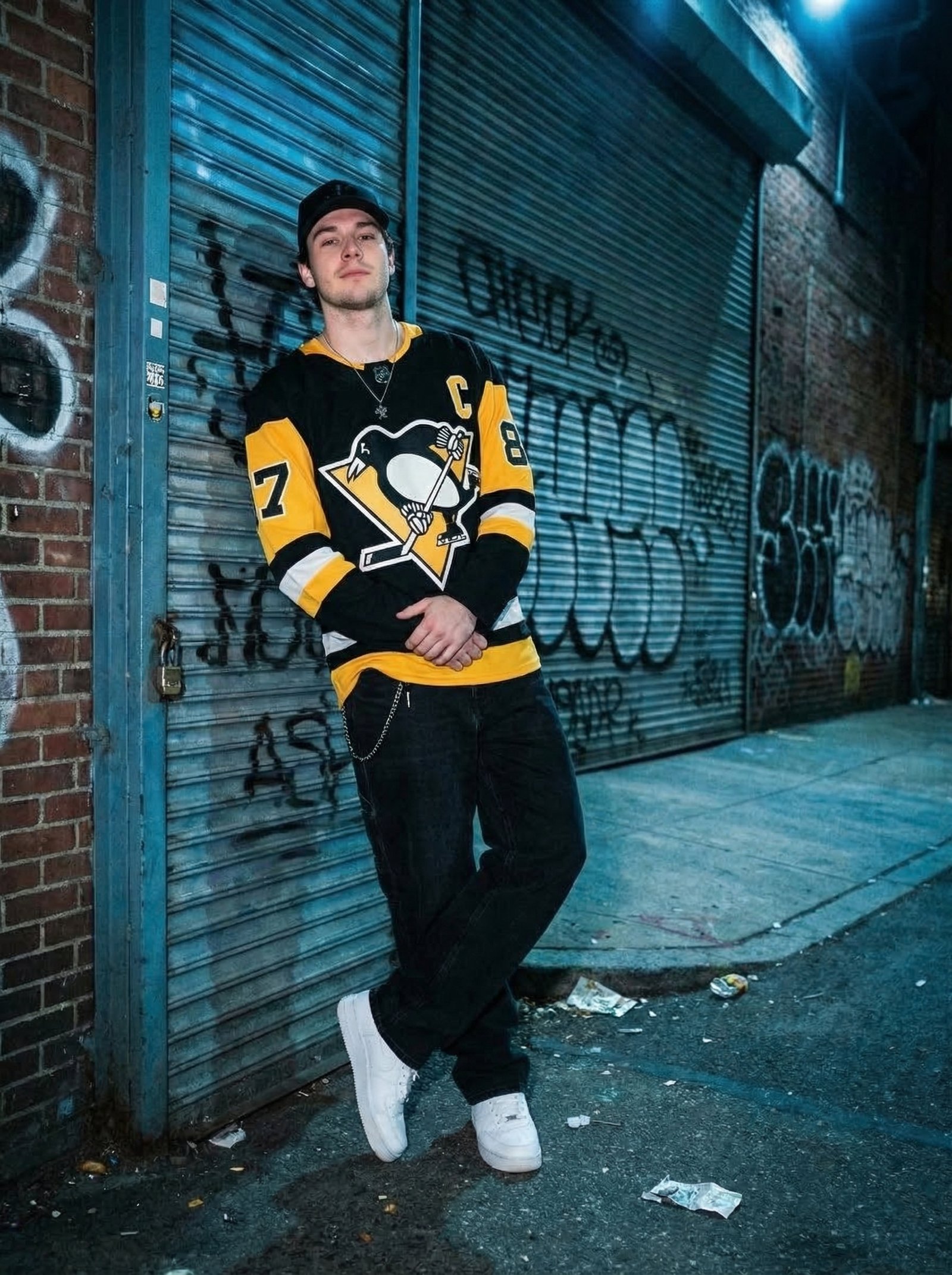 Urban editorial campaign for sports & streetwear. Night-lit alley setting, authentic street energy — generated with Nano Banana Pro.